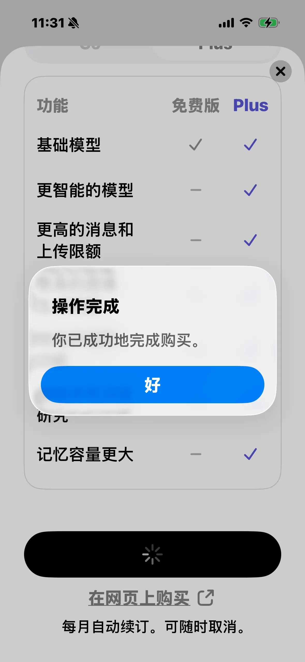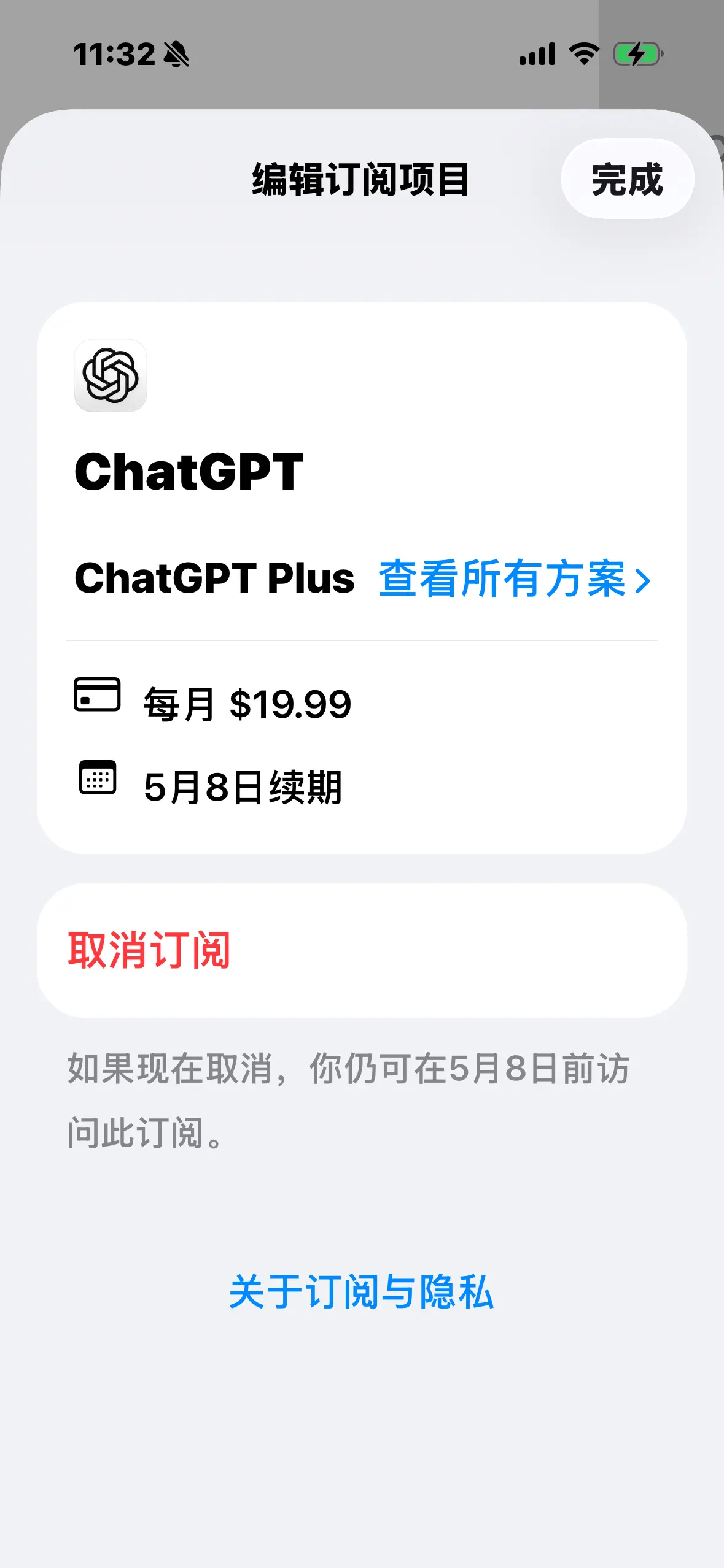 之后购买 ChatGPT Plus 就很方便,iPhone 上访问 ChatGPT 应用,应用内直接直接订阅,会自动从余额中扣款